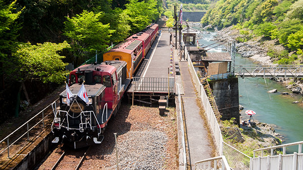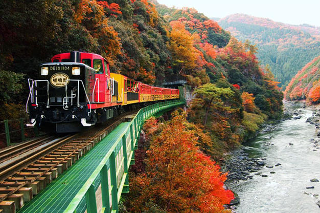 嵯峨野觀光鐵道是由柴油機車牽引的木制觀光列車。乘上該列出不僅能體驗到其懷舊的韻味,還能巡游古都京都四季風景各異的溪谷之美。
