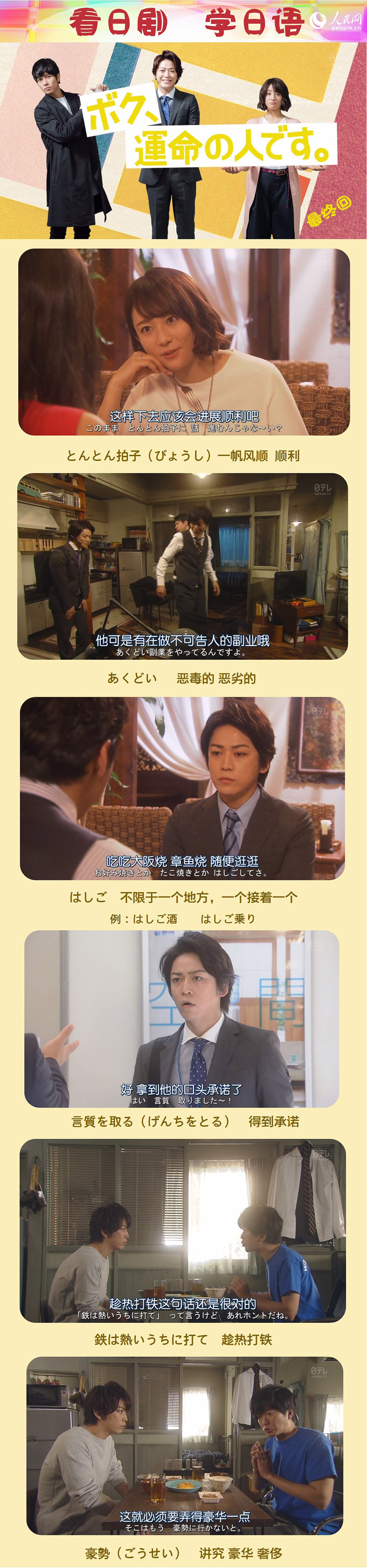 人民網東京7月2日電 2017春季日劇已接近尾聲了!龜梨和也·山下智久·木村文乃此次共同演繹《我命中注定的人》最終結局將會如何呢?本期《看日劇·學日語》為你解析最終回中的一些日語詞匯與表達,單詞本準備好了嗎?