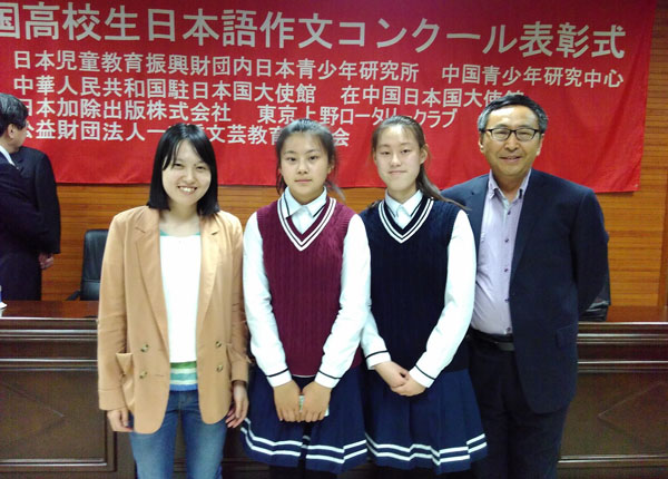 除了一些日常的課程,在這2年間學生們參加了很多的大會和比賽,還舉辦過由本校主辦的演講比賽和教師學習會。我所任職的高中是由沒有進入該地區高考班的學生組成的學校,當我最初提出“讓學生們參加比賽”的時候,很多老師都說“對這所學校的學生來說很難”。盡管如此,在日語學科主任的協助下,首次參加合唱大賽就獲得了銅牌。學生們以此為契機,之后多次在全國性的大賽中獲獎。為了參加表彰儀式和決賽,還有學生首次乘坐火車前往北京,甚至還有學生在日語作文大賽中獲得特別獎而參加了訪日研修活動。通過學習日語,走入新天地的學生逐漸增多。在他們取得諸多成績的成長過程中,如果得知是和日語以及與我有關聯的話,我就會倍感欣慰。
