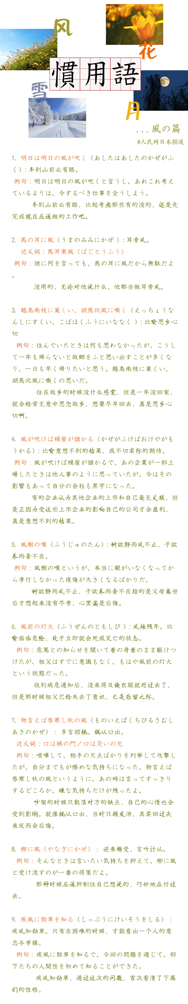 風·花·雪·月,自然界美麗多情的事物,渲染著文人筆下的浪漫情懷。日語中,與大自然相關的慣用語數不勝數。今天來學習一下與風有關的日語慣用語。(策劃/陳思 李思琪)