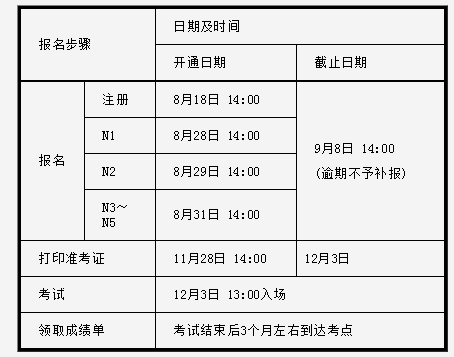 網上報名分兩個階段進行。第一階段考生僅進行個人信息注冊和上傳電子照片;第二階段除考生可繼續注冊外,按N1、N2、N3~N5的順序依次分別開放考試名額供已完成個人信息注冊與上傳電子照片的考生選擇級別和考點,此階段要求考生完成預定考位和支付考費等全部報名手續。