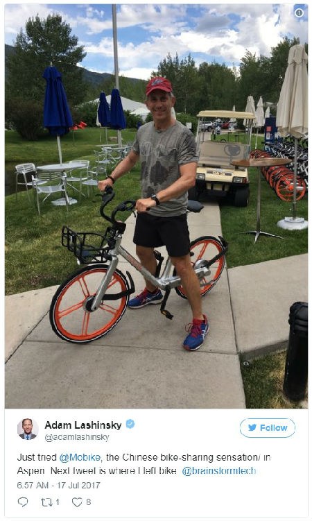 《財富》副總編亞當·拉辛斯基在會場附近體驗摩拜單車。(美國《財富》雜志網站)