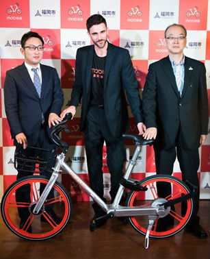 從左至右:福岡地域戰略推進協會石丸修平(音)、摩拜單車海外拓展總監克里斯·馬丁、福岡市綜合事務&規劃局首席長官長浦廣彥(音)。摩拜供圖