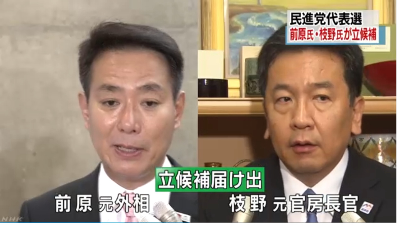 人民網東京8月21日電(許永新)21日,日本最大在野黨民進黨代表選舉正式拉開帷幕。據NHK電視臺報道,21日,民進黨代表選舉發布公告,前外務大臣前原誠司(55)與前官房長官枝野幸男(53)宣布參加競選。