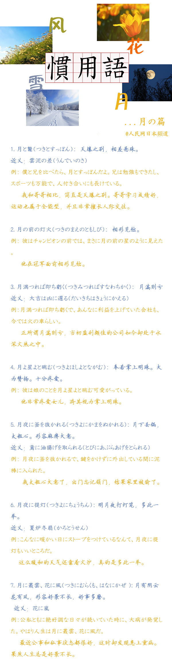 風·花·雪·月,自然界美麗多情的事物,渲染著文人筆下的浪漫情懷。日語中,與大自然相關的慣用語數不勝數。今天來學習一下與月有關的日語慣用語。(策劃/陳思 李霞)