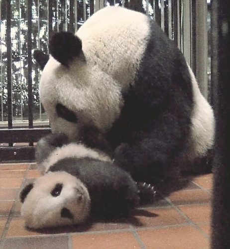 在產房照顧寶寶的熊貓媽媽(圖片來自朝日新聞網站)