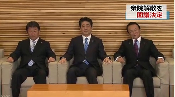 在國會召開的當天解散眾議院,這是繼1966年、1986年、1996年之后第4次,本次眾議院選舉將在10月10日發布公告,22日投計票。