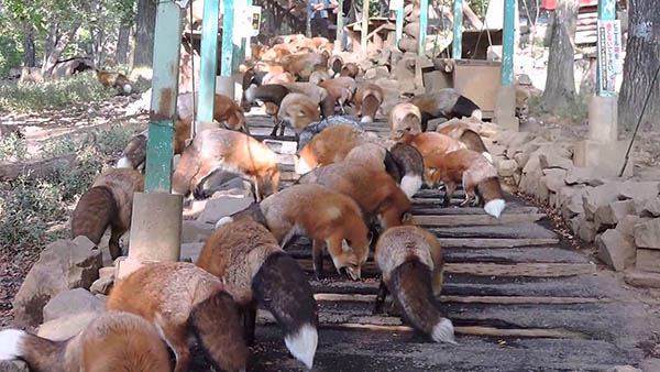 狐貍村是日本宮城縣白石市西北部的村莊,以狐貍著稱。狐貍村內擁有100多只狐貍,游客可與其零距離接觸。整個狐貍村并不是特別大,說是村更像是一個日式寺廟。逛兩個多小時也已經是足夠了。到這里的人也主要不是為了欣賞風景,而更多的是接觸狐貍這種難以成為寵物的生物。在出口處還有一個以狐貍主題商店,可以買到許多紀念品。藏王狐貍村有指定的投食點,狐貍看到有人來投食就會聚集過來。