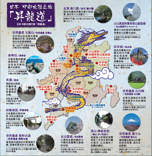 報道稱,該機構將攜由日本中部·北陸地區9縣組成的“升龍道”旅游項目積極在歐洲各國召開的旅行博覽會出展。這是該機構負責人13日在名古屋召開的研討會上所透露的消息。