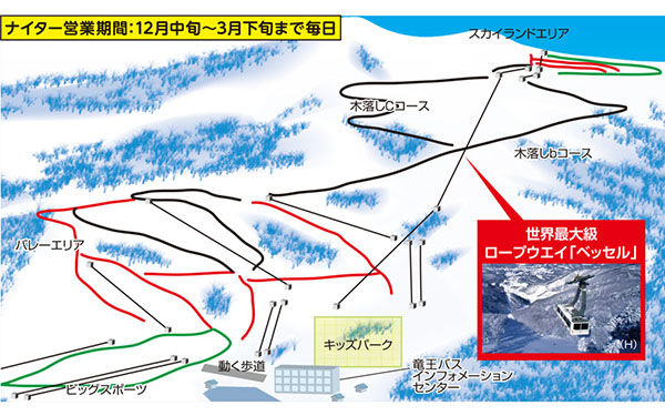 滑雪場充分利用山地地形,擁有豐富多樣的25條雪道。從山頂一路長長的滑到山腳,能充分享受滑雪的樂趣!