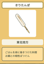 所謂切蒲英,就是把搗碎的米飯像魚卷一樣卷在杉木串上,烤成米糕,然后從串上取下,切開食用。切蒲英是秋田縣的特產,可以放入雞湯里煮,也可抹上味增烤著吃。