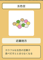 五色豆是指染了五種顏色的糖豆,是京都的著名點心之一。五色豆需要先將豆子炒熟,然后包裹上五彩色的糖衣,顏色主要是白、青、紅、黃、黑,其中白色代表金,青色代表木,紅色代表火,黃色代表土,黑色代表水,合起來就是大地的象征。