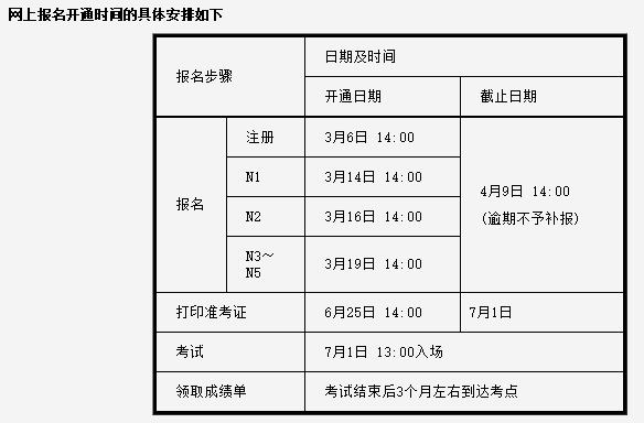 網上報名分兩個階段進行。第一階段考生僅進行個人信息注冊和上傳電子照片;第二階段除考生可繼續注冊外,按N1、N2、N3~N5的順序依次分別開放考試名額供已完成個人信息注冊與上傳電子照片的考生選擇級別和考點,此階段要求考生完成預定考位和支付考費等全部報名手續。