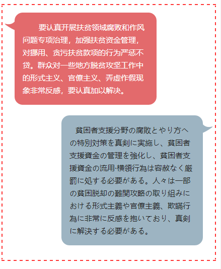 (日)貧困者支援分野の腐敗とやり方への特別対策を真剣に実施し、貧困者支援資金の管理を強化し、貧困者支援資金の流用·橫領行為は容赦なく厳罰に処する必要がある。人々は一部の貧困脫卻の難関攻略の取り組みにおける形式主義や官僚主義、欺瞞行為に非常に反感を抱いており、真剣に解決する必要がある。
