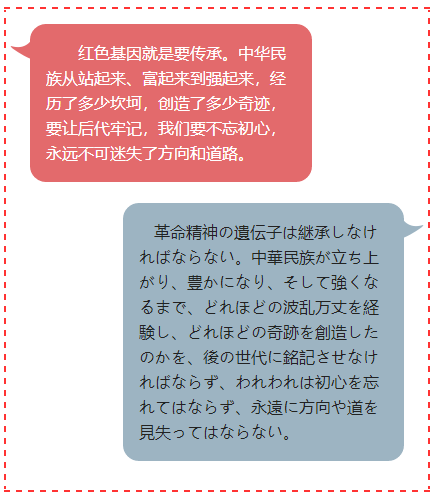 (日)革命精神の遺伝子は継承しなければならない。中華民族が立ち上がり、豊かになり、そして強くなるまで、どれほどの波亂萬丈を経験し、どれほどの奇跡を創造したのかを、後の世代に銘記させなければならず、われわれは初心を忘れてはならず、永遠に方向や道を見失ってはならない。