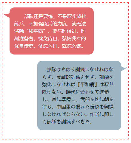 (日)部隊はやはり訓練しなければならず、実戦的訓練をせず、訓練を強化しなければ『平和病』は取り除けない。時代に合わせて進歩し、常に準備し、武器を枕に朝を待ち、中國軍の優れた伝統を発揚しなければならない。作戦に即して部隊を訓練すべきだ。