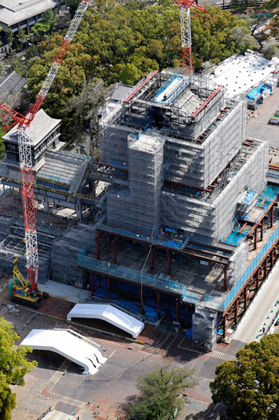1960年使用鋼筋混凝土重新修建的大天守在大地震中,除了多數瓦片及兩邊獸頭瓦掉落外,內部的展示品也倒塌損壞。熊本市政府制定了于2019年度修復大天守外觀的計劃,預定于本月6日將率先復原的獸頭瓦放置上屋頂。
