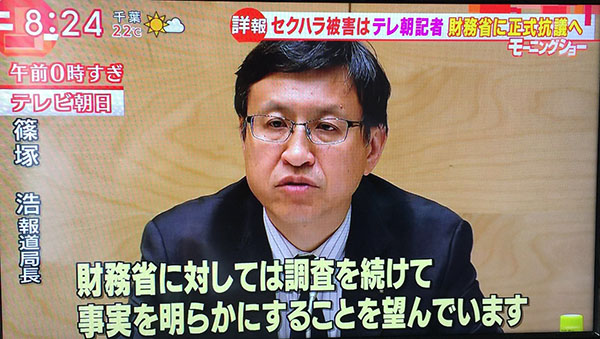 人民網東京4月19日電(許永新)據NHK電視臺報道,日本財務省事務次官福田淳一因被曝言語性騷擾而在18日辭職。朝日電視臺緊急召開與此相關的記者會,會上發布消息稱,受到性騷擾的記者中有本公司員工,而且將錄音提供給一家雜志社。19日凌晨,朝日電視臺東京總社報道局局長篠塚浩發布消息稱,受到福田淳一性騷擾的記者當中有本公司員工。福田淳一雖然否認有性騷擾行為,但對錄音及財務省有關發言內容進行調查后發現,聲音確屬福田淳一本人的聲音,認定性騷擾行為屬實。他同時透露,將向財務省提出正式抗議。