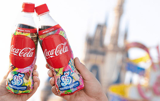 限定款可口可樂(500ml、約12元)的包裝上印有東京迪士尼度假區35周年的標記以及東京迪士尼樂園和東京迪士尼海洋樂園的一些經典畫面和表演鏡頭。限定款可口可樂可在園內餐車和自動販賣機處購買。