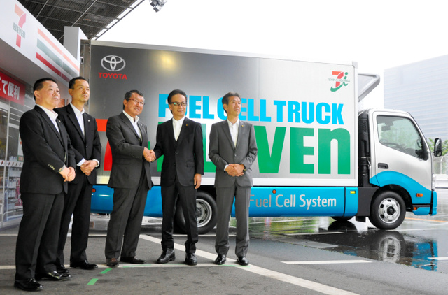 兩家公司曾于6日在東京都內對外公開了新開發的小型FC卡車,載重量為3噸,搭載了與豐田2014年開發的FC“未來”(MIRAI)轎車一樣的燃料電池。除了運送貨物,該車還可以將氫燃料產生的電能供冷柜使用。7·11打算首先在首都圈引入兩輛車試行,以已經建好氫燃料補給站的東京都大田區為中心,每日行駛約200公里,運送三明治和牛奶等冷藏商品。在遇到自然災害的時候FC卡車甚至可以為7·11的店鋪輸送電力。
