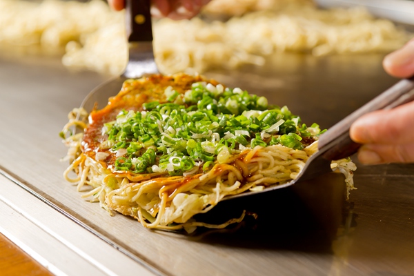 在烤得薄薄的面團上按順序撒上大把的卷心菜絲、天婦羅面衣渣、墨魚天婦羅、青蔥、豆芽和五花肉,然后加上炒面和雞蛋,廣島御好燒便做好了。想要做好廣島御好燒需要熟練的技術。