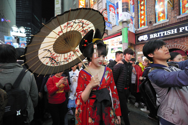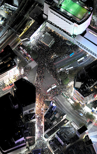 在澀谷站前的十字路口附近,到了傍晚就呈現出非常擁擠的態勢。身穿游戲、動漫服裝的人們大喊著:“Happy Halloween。!”人們或是用手機拍照、或是分發糖果。一名來自東京都府中市、和朋友穿著女仆裝參加活動的高二女生說:“跟很多不認識的人一起拍照游玩,大家都非常開心,真是太棒了!