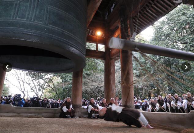 日本京都知恩院正在敲鐘的僧侶們(圖片來源:朝日新聞網站)