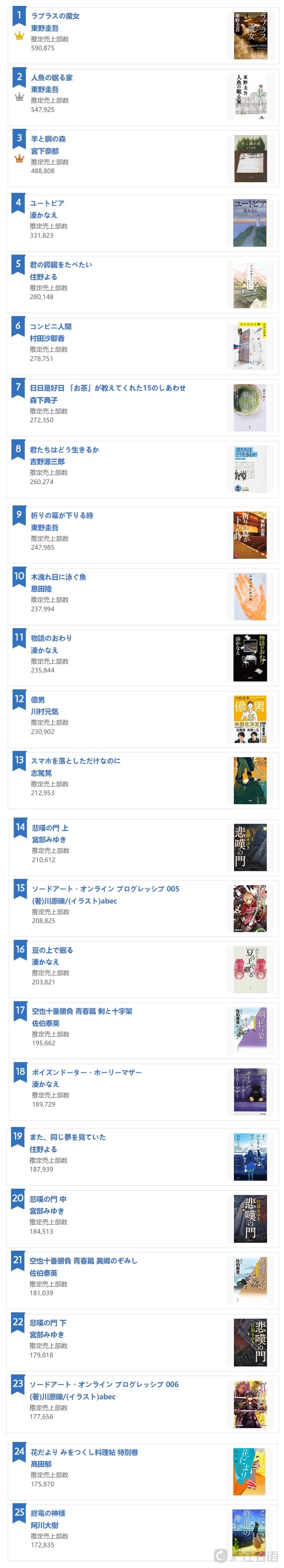 2018年日本文庫本銷量排行,東野圭吾的《拉普拉斯的魔女》憑借59.1萬部的期間銷量獲得第一。第二名也是東野圭吾的作品,銷量54.8萬部的《沉睡的人魚之家》,東野圭吾獨占年度文庫排行前兩位,是自2015年的《解憂雜貨鋪》(2014年11月發售)和《禁忌魔術》(2015年6月發售)以來第二次。