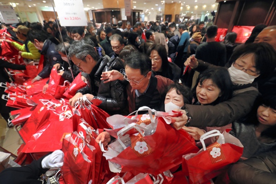 人民網東京1月2日電 據日本時事通信社報道,日本各地的大型百貨店和一些超市在1月1日例行舉辦了新年首賣活動。西武池袋總店已經連續7年在元旦進行首賣活動,上午10點開門的時間還沒到,就已經吸引了大約2萬人的到來。數量限定的福袋和促銷商品讓商場內熱鬧非凡。在今年暖冬的影響下,除了限量的大衣,裝有手提包和圍巾等物品的5000日元(約合人民幣313.8元)價位福袋也廣受歡迎。