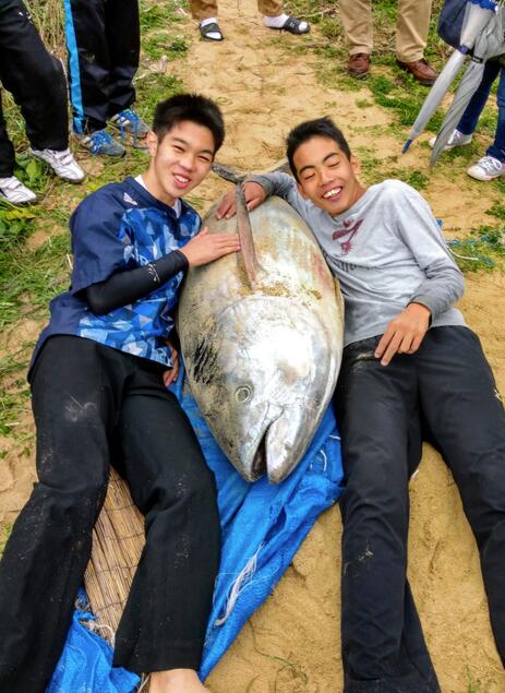 日本兩少年徒手捕獲身長174cm的巨大金槍魚(圖片來源:朝日新聞網站)