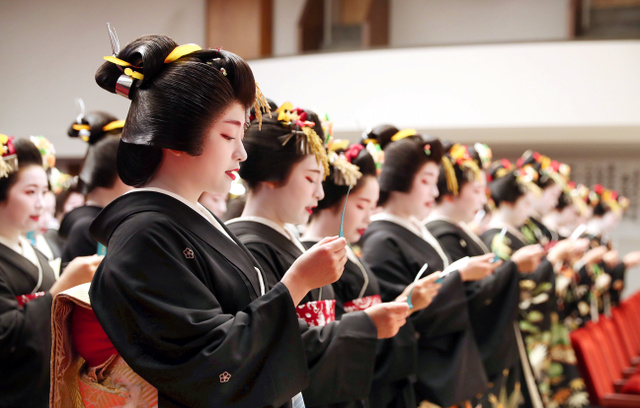 祗園東的藝妓舞妓們在“始業式”宣誓。(圖片來源:日本《朝日新聞》網站)