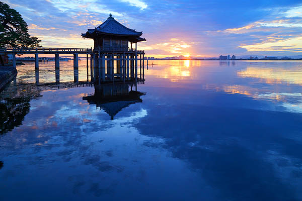 浮御堂,是一座“漂浮”于湖面之上的寺院,據稱在平安時代由惠心僧都為祈求湖上安全和超度眾生而建。寺院內的觀音堂里供奉著重要文化遺產圣觀音座像。浮御堂以近江八景之一的“堅田落雁”而聞名,其寺名為海門山滿月寺。