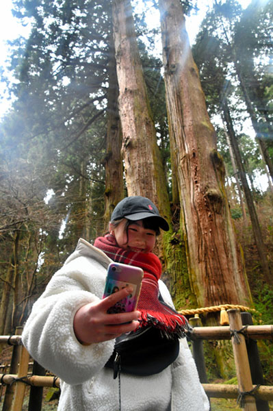 在御神木(神樹)前自拍地坂本優月。(圖片來源:日本《朝日新聞》網站)