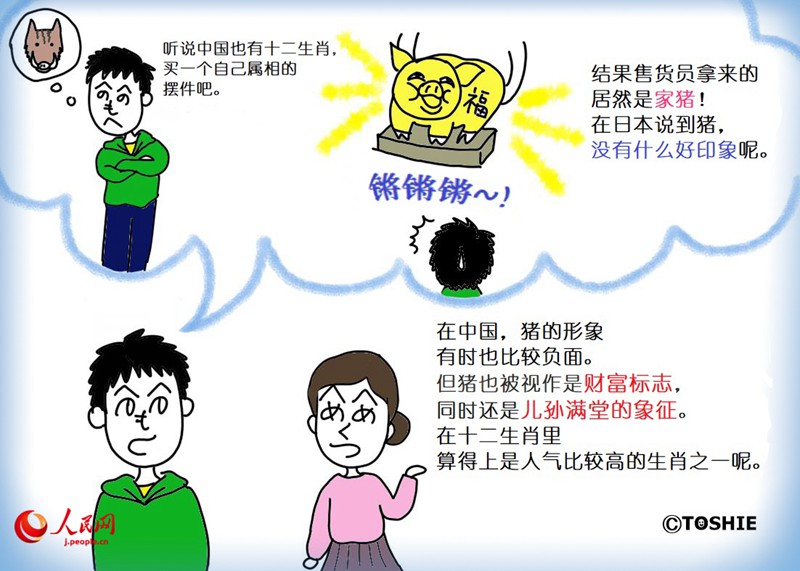 一個屬豬的日本人來到中國,打算購一個自己屬相的擺件。售貨員拿來了家豬的擺件,他看到之后,吃了一驚。因為在日本,家豬給人的印象并不是很好,大多用于表達負面含義。在中國,豬雖然有時也以消極形象出現,但更多被視作是財源廣進、兒孫滿堂的象征,算得上是十二生肖里人氣比較高的生肖之一。