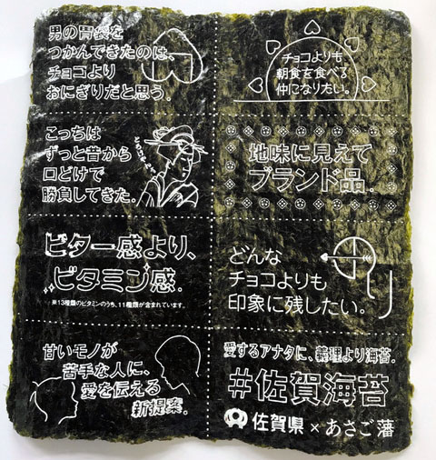 屆時,佐賀縣將送出1千份長21厘米寬19厘米的海苔片,上面用可食用的白色顏料印著“海苔比巧克力更能抓住男性的胃”、“與其吃苦,不如吃維他命”等有趣的文字和圖案。海苔將從14日上午7點半開始在澀谷車站南口的“摩艾像”附近派發。
