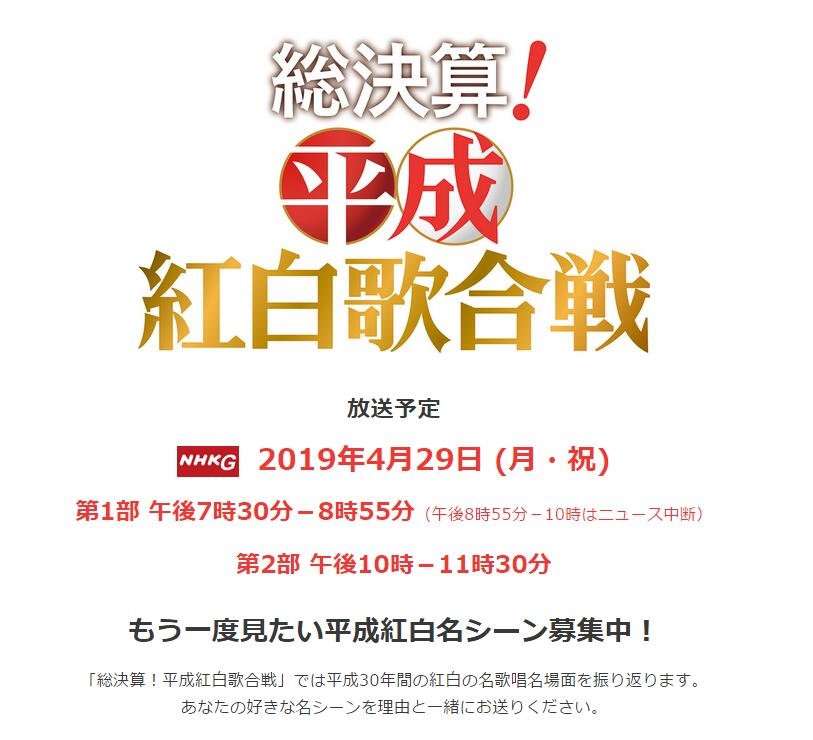 據悉,NHK“平成紅白歌會”將分為兩部分。第一部分將回放平成30年里的知名曲目及演唱錄像。3組平成紅白歌會代表藝人“嵐”、北島三郎、松田圣子也將現身錄制大廳,一同回顧充滿感動的回憶及幕后故事。目前,NHK也在向觀眾征集,希望再次播放的平成時代紅白歌會曲目。(編譯:袁蒙 審稿:陳建軍)