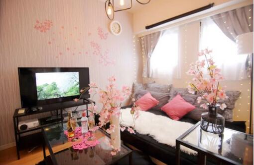 這是一間十分可愛的租賃屋,來這里就像到一位獨居的女性好友家做客一樣。在布置有粉櫻的賞花區里享用美食,談天說地,困了就在沙發上小憩。