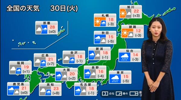 28日,全日本天氣基本穩定,晴天居多。單從周一開始,西日本的天氣開始變天,周二周三下雨的地方增多。