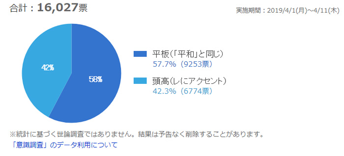 同時,日本雅虎新聞還曾于2019年4月1日-4月11日針對“令和”一詞的讀法進行了調查。該調查共收集到16027份結果,其中有57.7%的人選擇“平板型”,42.3%的人選擇“頭高型”。(策劃/袁蒙 于舒婷)
