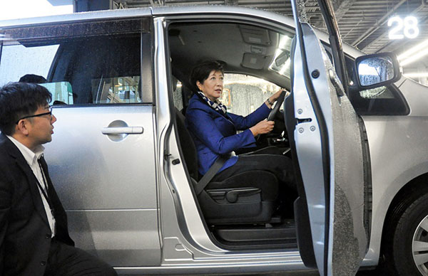 日本東京都知事小池百合子試乘裝有安全裝置的汽車。(圖片來源:日本《朝日新聞》網站)