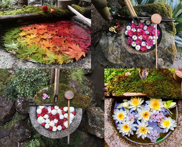 京都長岡京市的楊谷寺以“四季花手水”著稱。楊谷寺內共有7個凈手池,每個季節都裝點以當季花卉,例如新年時的花手水就是紅白二色的菊花裝飾,秋季則為紅葉。