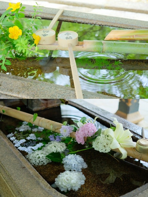 與楊谷寺凈手池中滿滿的繡球花不同,京都真如堂僅使用幾只鮮花,便將花手水裝點得十分淡雅,更有一種低調沉穩的美感。而在其他季節,周圍的樹葉也會倒映在水池中,更為花手水增添了一份色彩。