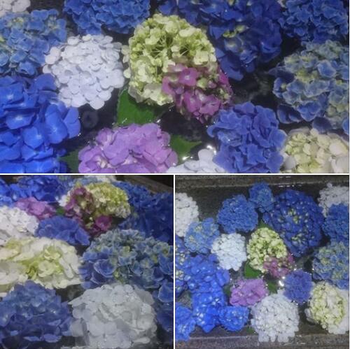 今宮神社的繡球花手水同樣美麗。清水從一旁的龍口流出,流入長90cm、寬50cm的水盤里,水面上藍紫色和白色的繡球花均為神社內摘取。今宮神社宮司金子立表示,“神社有習俗,要向神明供奉美好的事物。希望來參拜的人們,也能感受到季節的變化!