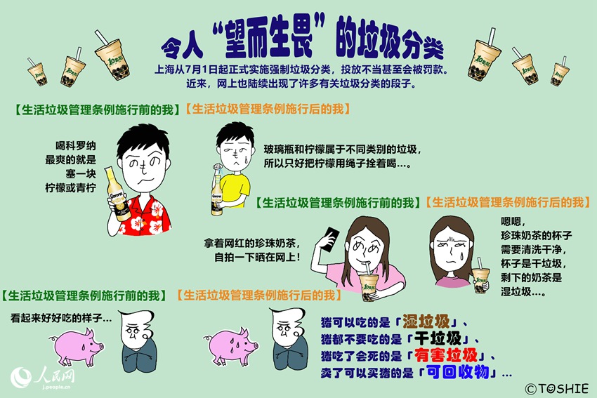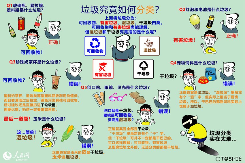 上海從7月1日起正式實施強制垃圾分類,投放不當甚至會被罰款。近來,網上也陸續出現了許多有關垃圾分類的段子:“上海人現在見面都問‘你是什么垃圾’?”“從今天開始,上海的科羅納再也不能塞檸檬了!薄柏i能吃的就是濕垃圾,豬不能吃的就是干垃圾!备芯W友提問:“老公是屬于可回收物還是有害垃圾?”還有人抓住商機,推出垃圾代分類服務、手機APP垃圾分類指南及回收,分類專用垃圾桶和食物垃圾處理器也受到了人們的關注。