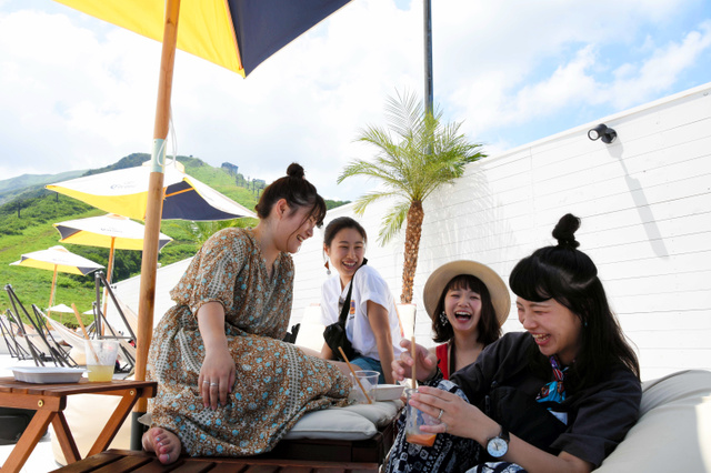 4日中午,在白馬的八方尾根,只需渡過搖搖晃晃的吊橋之后,就能看到由椰樹、遮陽傘和吊床等構成的度假畫面。有人穿著泳衣享受泡泡浴,或是在用滑雪場纜車改裝的桑拿室里蒸桑拿。一旁還有販賣漢堡和酒品的商店,仿佛來到了海灘度假圣地一樣。