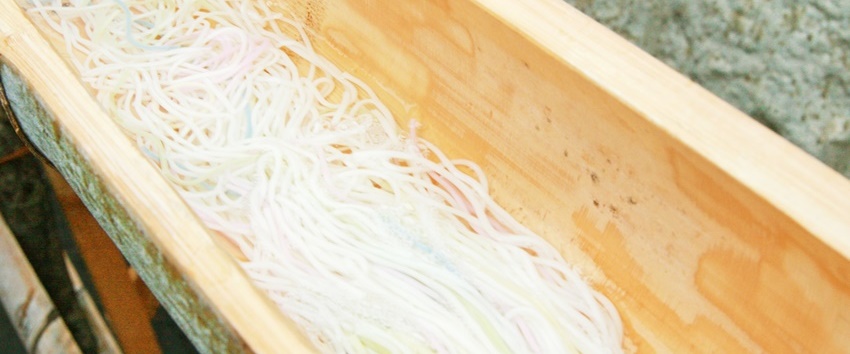 流水素面是日本夏季非常傳統的一項消暑活動。據悉,流水素面于昭和30年(1955年)發源于九州宮崎縣高千穗町的高千穗峽,當地人夏天在野外干活時,會把素面煮熟,放在青竹里,借用清澈的山泉水食用。之后,這種吃法也普及到了日本全國。>>>>