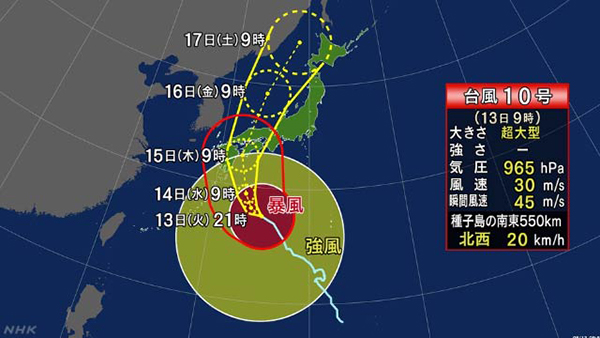 另外,伴隨著臺風的來臨,日本附近海域將出現暴風雨和大浪,四國附近海域14日的海浪高度將達到10米。