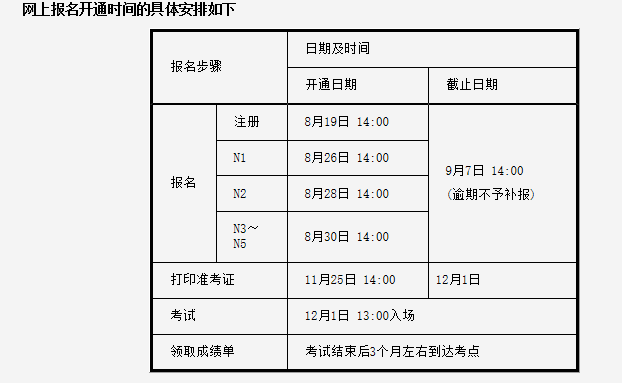 網上報名分兩個階段進行。第一階段考生僅進行個人信息注冊和上傳電子照片;第二階段除考生可繼續注冊外,按N1、N2、N3~N5的順序依次分別開放考試名額供已完成個人信息注冊與上傳電子照片的考生選擇級別和考點,此階段要求考生完成預定考位和支付考費等全部報名手續。