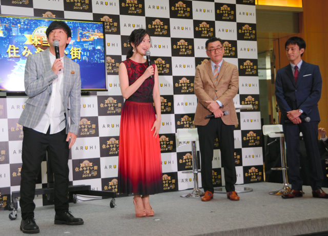 搞笑藝人向井慧(左一)和女明星北原里英(左二)在排名揭曉活動上亮相。(圖片來源:日本《朝日新聞》網站)