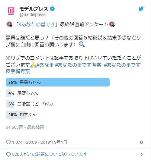 在劇集正式完結前,Modelpress網站在推特上進行了一項有關“誰是幕后黑手”的調查,共收到94603張投票。其中,75%的投票者認為幕后黑手是黑島,所占比率最高;其次是翔太(15%)、二階堂(6%)、尾野(4%)。許多網友認為,“二階堂襲擊翔太是在保護黑島,就像櫻木護士保護藤井醫生那樣”,“因為翔太依舊懷疑黑島,而AI推測的兇手也是黑島,所以二階堂也認為黑島就是犯人,一心想要保護她才會采取一系列行動”。還有網友大開腦洞,認為“二階堂可能是黑島家庭教師的弟弟,為了探明當年的事件才來到東京”,“其實二階堂是一名年輕的網絡搜查員,此前就與高知的事件有所關聯,為了接近黑島才搬進公寓”。(編譯:袁蒙 審稿:陳建軍)(來源:Modelpress)